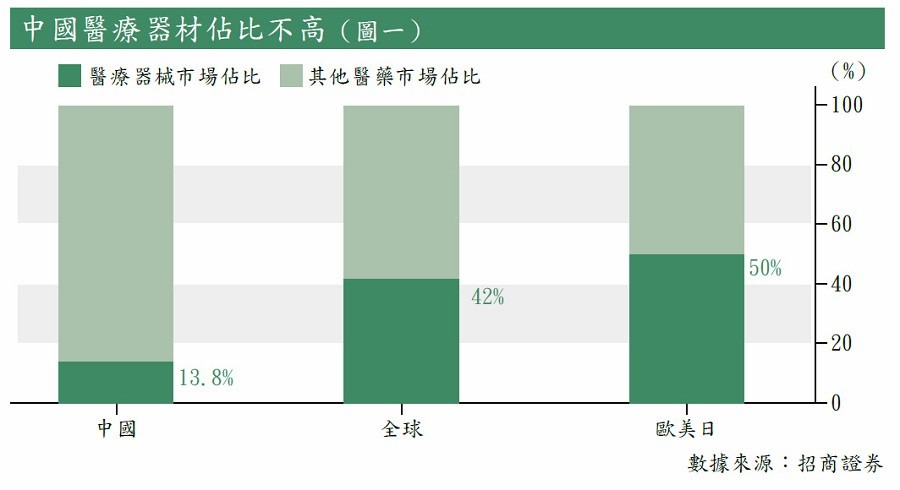 根據研究機構EvaluateMedTech的數據,全球去年醫療器械市場規模為4,250億美元,按年增速5.5%,其中美國佔全球市場約四成;而同期中國市場規模達到4,701億元(人民幣,下同),按年增12.6%,佔全球市場約12%。雖然增速不算太驚人,但在發達國家,醫療器械佔醫療消費約一半,而中國則僅為14%(見圖一)。即使中國醫療市場沒有增長,但若內地跟隨發達國家的發展趨勢,醫療器材的普及亦足以帶動行業增長。