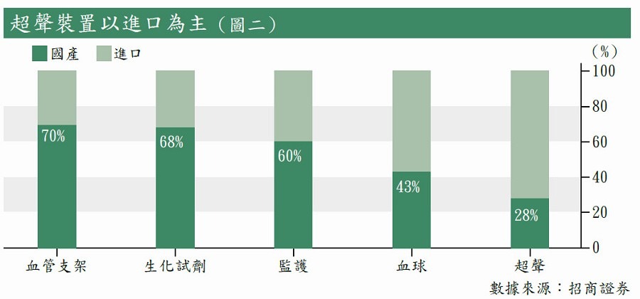 現時中國大型及高端醫療器材市場,如超聲波、核磁共振等儀器,均由外資GPS(GE醫療、Philips及Siemens)主導,本地企業以中低端市場為主(見圖二),中國企業對外出口的產品亦以中低端產品特別是耗材為主。