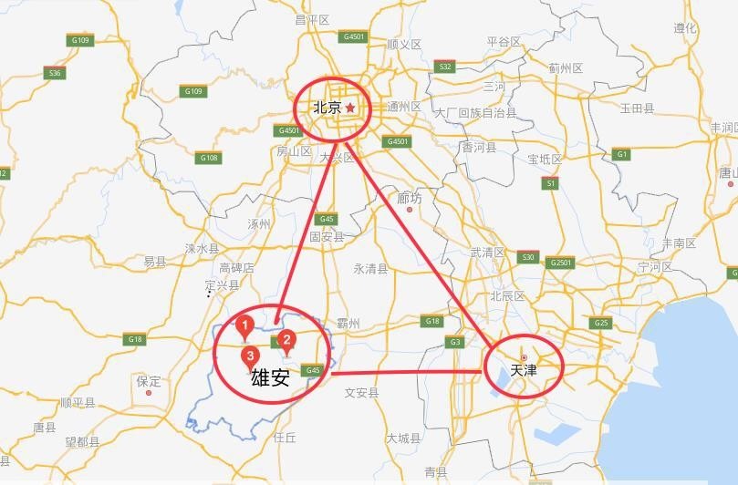 雄安新區在地理位置上與北京、天津構成一個「鐵三角」。雄安與北京城市副中心的聯動,將更有效地帶動京津冀一體化的發展(百度地圖截圖)