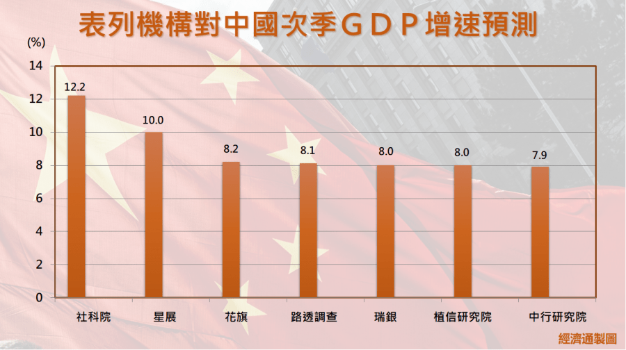 據《經濟通通訊社》整合資料顯示,中外資機構對內地第二季的經濟增長預測介乎7.9%-12.2%,僅中國社科院和星展的預測達雙位數;而據《路透》統計的51家機構的預測中值為8.1%。