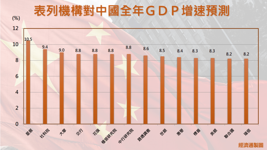 與此同時,機構對中國全年經濟增長預測區間較為集中,介乎8.2%-10.5%,且預測值均超過中國監管此前定下的增長6%以上政策目標。