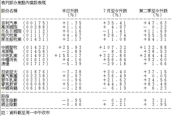 接力向上的內需股有汽車股,匯證認為,內地汽車業第二季銷售值跌3%,較首季的跌41%明顯改善,相信最差的時候已經過去,尤其看好吉利(00175)及長汽(02333),分別維持「買入」評級;惟兩股周一上午沒大起色,前者微升約1%報16.52元,後者無升跌,報7.57元。至於被匯證下調評級、由「買入」降至「持有」的廣汽(02238)則繼續追落後,半日急漲近3%,7.63元。