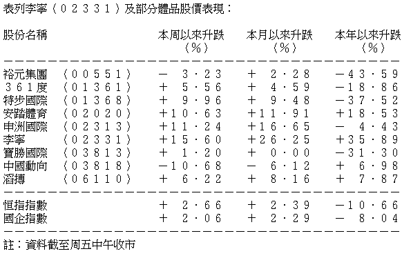 「體操王子」李寧(02331)周五(14日)上午公布中期少賺逾一成四至6.83億元人民幣惟勝市場預期,刺激股價半日高見32.3元創新高,半日收升8.25%,報31.5元。