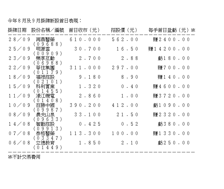 《新股掛牌》四新股齊發三隻高收 天任升近2倍毫股變蚊股!