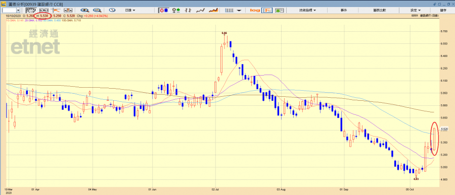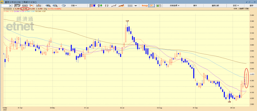 另外,他指目前內銀板塊適合較保守的投資者「博反彈」,主要推薦大家買入建行及工行(01398),因為兩股為權重股,故較能受惠大市氣氛轉好。他建議投資者於5元至5.2元買入建行,目標價上望6元至6.2元,若連續2日跌穿4.8元應止蝕;工行可於3.8元至4元買入,目標價上望4.8元至5元,若連續2日跌穿3.8元亦要止蝕。他補充,中行股份升幅往往較遜色,惟息率較高可作收息選擇。