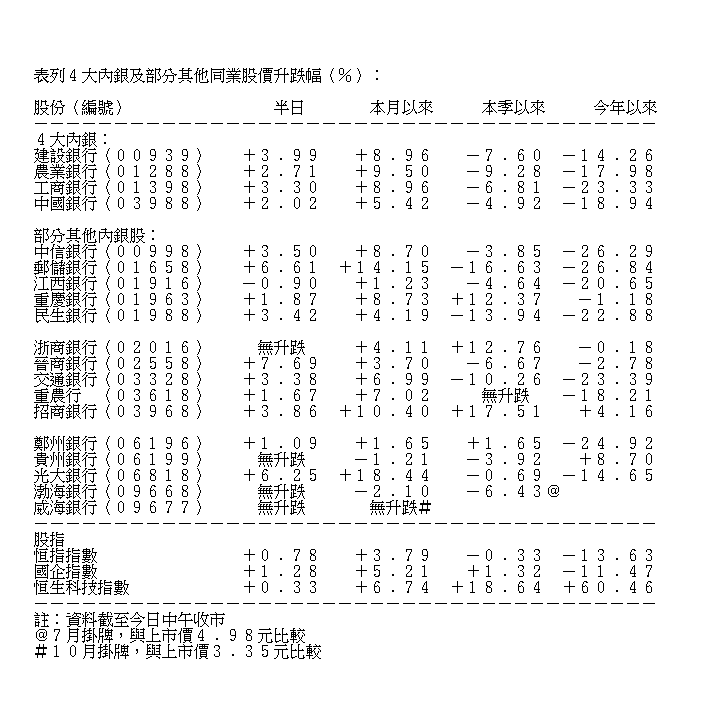 政策出爐,有大行亦改變內銀股看法。花旗發表報告,指上述政策判斷是基於內地第三季度經濟恢復好於預期,可能減輕中資行讓利的政治壓力,盈利下降導致不斷上升的資本壓力,或會損害銀行的信貸擴張能力;同時不同銀行的不良問題也各有差異,預計中資行三季度淨息差將勝預期,非利息收入維持穩定。該行料中資行第三季業績勝預期。
