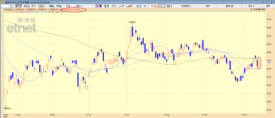紓困方案和疫苗問題未解決,當晚美股三大指數下跌之下,港股昨日(15日)低開,而中國公布9月CPI表現差過市場預期,午後美股三大指數期貨跌幅擴大,科指跑輸,當中阿里巴巴(09988)及騰訊(00700)跌幅顯著,恒指收挫508點,報24158點,再度失守五十天和百天線。