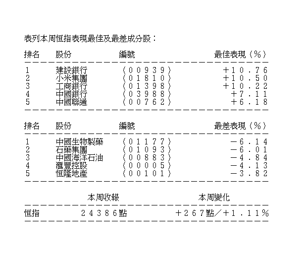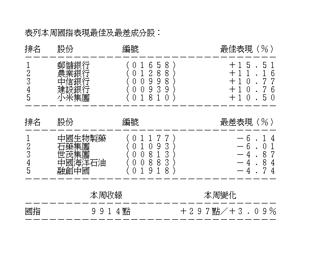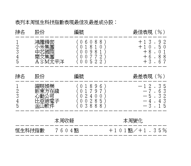 雖然昨日科指一度落後,但整周仍升101點或1.35%,報7604點,漲幅跑贏恒指。小米(01810)核心供應商大會今日舉辦,全周漲10.5%,報23.15元,董事長雷軍早前豪言,要用3至5年時間在歐洲市場取得成績,最終在區內智能手機市場佔有率第一。阿里巴巴受旗下螞蟻遭美國列入貿易黑名單消息所困,今日有消息人士向本地媒體指,螞蟻未在美國開設當地版本的支付寶,故不涉收集美國用戶數據,全周升2.73%,報294元。騰訊升3.24%,報557元。中芯(00981)向上修訂第三季收入和毛利率,全周升8.01%,報19.96元。