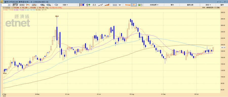 循腺病毒載體(Ad5-nCoV)研究新冠疫苗的康希諾生物半日升5.35%,報189.2元。該股將於下周二(27日)公布第三季業績。不過,自從康希諾生物A股(滬:688185)於八月上市後,該股H股升勢逐漸減弱,近月在跌穿200元大關後,最低曾見141.1元。以現價計,較7月底高位280元仍累跌三成二。