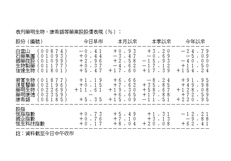 藥明巨諾將成為藥明系第三家上市公司,帶動同系上升。藥明生物半日揚11.61%,報報225元,為最佳表現藍籌股,盤中高見233元,創上市新高;單是今年以來,已累升近1.3倍。而藥明康德半日無升跌,報118.7元。