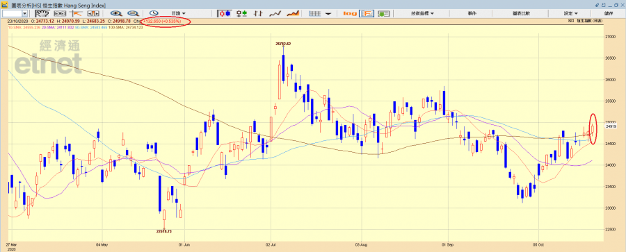 市場持續關注美國總統大選消息及財政刺激方案能否達成,美股逐步回穩,帶動港股再行上升,恒指重返百天線(24733點),全周升足五日,累漲531點,連升四個星期。