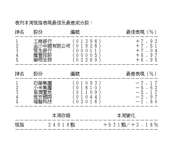 匯控(00005)下周二(27日)公布季度業績,本周股價升近7%報32.25元;恒生銀行(00011)收121.7元升約7%;中銀香港(02388)報22.05元 升3.52%;渣打集團(02888)報39.8元急漲10.25%。