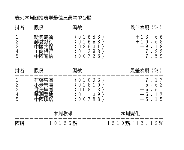 內銀走勢造好,其中中金公司發表研究報告指,內地銀行的業績表現在第三季後有望陸續提升,相關股份本周上揚。建行(00939)本周升4.31%,報5.8元;工行(01398)本周升7.92%,報4.77元,為升幅最大恒指成分股;中行(03988)升1.95%,報2.61元;招行(03968)漲7.08%,報43.85元;交行(03328)升1.50%,報4.06元。