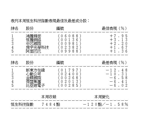 內媒報道指近期內地房地產金融監管政策加強,多間國有大銀行已收緊房地產經營貸的貸款條件,額度也有所收緊,內房股榮辱互見,中海外(00688)全周升0.20%,報19.62元;潤地(01109)全周跌5.17%,報33.95元;融創(01918)升1.37%,報29.55元;碧桂園(02007)升2.91%,報9.9元;中國恒大(03333)跌5.18%報15元。