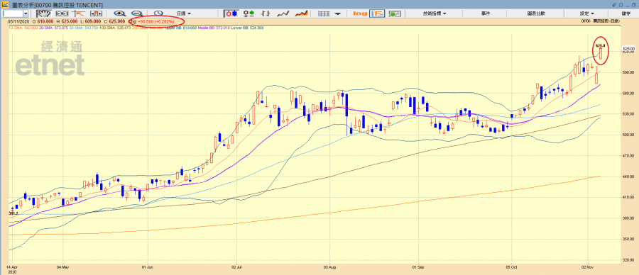 騰訊(00700)創上市新高,收升6.2%報625元。(經濟通HV2系統截圖)