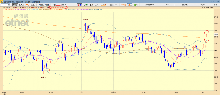 美大選後港股升809點收25695破牛熊線 科指新高漲逾5%