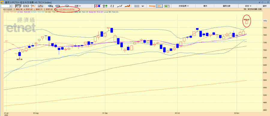 恒生科技指數報8181點,升422點或升5.45%。(經濟通HV2系統截圖)