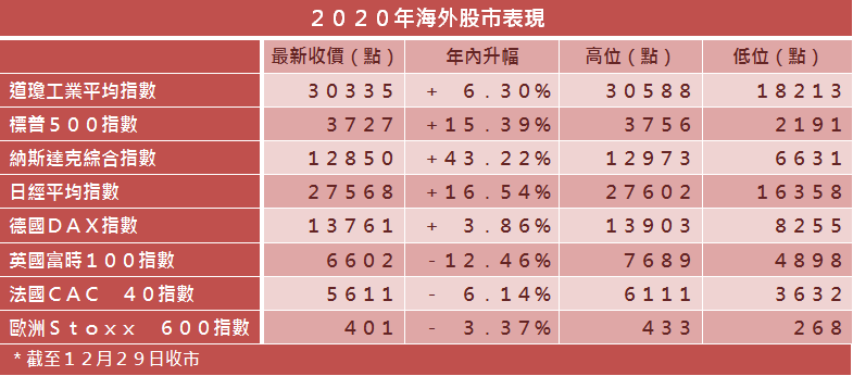 直到11月初美國大選前美股開始重拾升勢,因為美企第三季業績勝預期,加上大選結果拜登的得票遠高於總統特朗普勝出,同時國會參眾議院的形勢未變,市場解讀為有利選結果,帶動美股三大指數再次衝高。與此同時,輝瑞與BioNTech、Moderna、阿斯利康及牛津大學的新冠肺炎疫苗後期測試數據向好,資金在年結前夕由增長股輪動至價值股,道指終於在11月突破年初高位,並創歷來首次突破三萬點大關,而標指及納指在資金輪動下亦再創新高。美股踏入12月明顯出現整固,三大指數月內曾屢試高位,但力度明顯有所減弱,因為即使疫苗獲得批准,並在歐美開始接種,疫情亦未見有回落跡象,市場採取觀望態度,不過三大指數的年內最高高位亦在月內觸及,亦創出歷史新高,道指最高見30588點,標指高見2756點,納指高見12973點。
