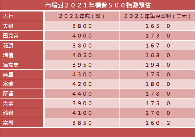 摩根士丹利首席環球資產策略師Andrew Sheets亦在《2021年全球投資展望》報告中持比較樂觀的態度,並預期明年經濟將延續今年5月開始的復甦,各種資產價格亦將繼續上漲,主要股市收益將增長25%至30%。大摩首席美股策略師Mike Wilson更預測2021年底標指目標為3900點,因為預期隨著額外的財政刺激措施出台,收益增長可能會出現爆炸性增長。