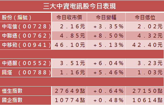 紐約證交所突然收回中國三大電信商中移動(00941)、中電信(00728)、中聯通(00762)美國預託證券(ADR)除牌決定,三大電信巨頭今日順勢回升,當中中聯通升最多,一度高見4.96元,收報4.85元,全日報復式上漲8.5%,突破50天線(約4.75元)。中移動及中電信則分別升5.13%及3.35%,報46.1元和2.16元。