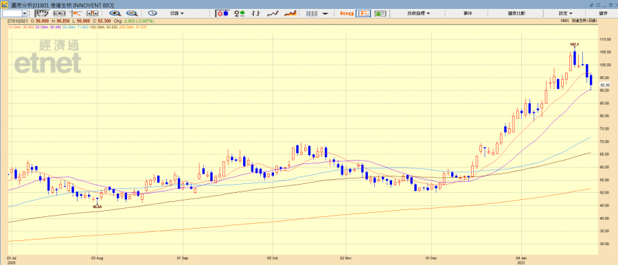 康希諾(06185)今早股價亦隨板塊大幅下跌7%。黃志陽指出,康希諾以疫苗為主打業務,因其他國家陸續推出疫苗而股價升勢受限,故投資者選擇「B股」以可預測前景為重,做足功課考慮研發醫藥及科技前景。當中,他看好信達生物(01801),建議投資者可待其回落至廿天平均線(約90.53元)水位入市。醫藥股當中,他推介藥明系的藥明康德(02359),同樣以廿天平均線(約172.435元)入市時機。信達生物及藥明康德均不是「B」字標記股份。