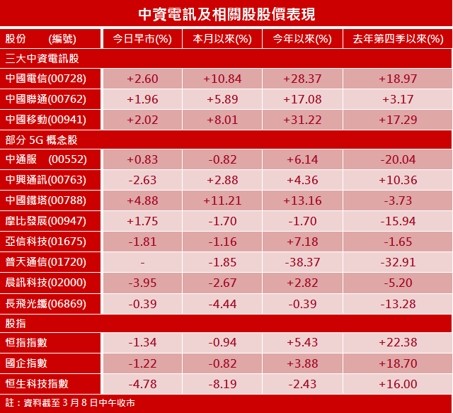 美債息升,科技股持續走弱,而一度受制裁陰霾影響的中資電訊股板塊收復失地,短線表現突圍而出。瑞信近日亦發表報告唱好中資電訊股,予以跑贏大市評級。銳升證券聯合創辦人及首席執行官鄧聲興向《經濟通通訊社》表示,5G概念下電訊股明顯受惠,投資者可作部署。