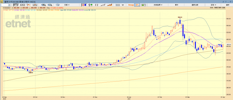 華盛證券證券分析師聶振邦向《經濟通通訊社》表示,港交所放寬第二上市門檻當屬利好,近年港交所銳意招攬中概股來港上市,是次建議擴闊制度有助吸納更多企業赴港掛牌。消息公布後,今早該股買盤力度強勁,持續高位橫行,反映港交所續受資金青睞。然而該股從421元低位(3月25日最低價)反彈至今,已累升近一成升幅,有獲利盤出現亦屬正常,但即使短期再現回調亦於450元水平有一定支持。