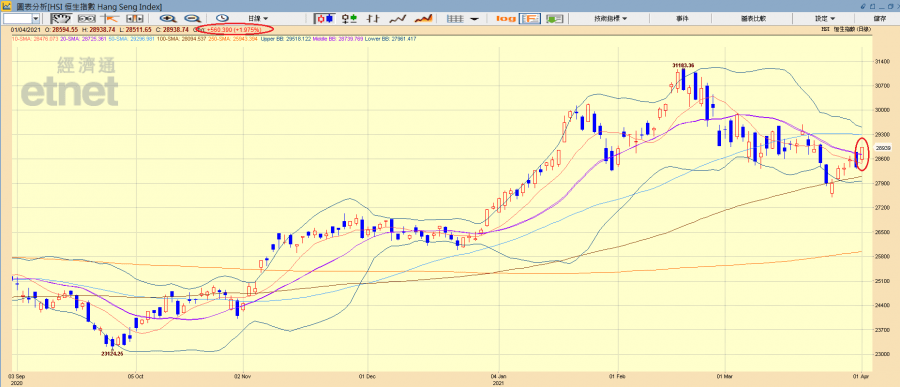 市場等待拜登公布基建計劃細節,隔晚美股走高,納指領跑升近2%。今日港股高開216點報28594點,雖然上月財新中國製造業PMI差過預期兼創近一年低,無阻資金流入新經濟股撐市,美團(03690)、騰訊(00700)領跑,港股收於全日、兼周內高位28938點,升560點或1.97%。