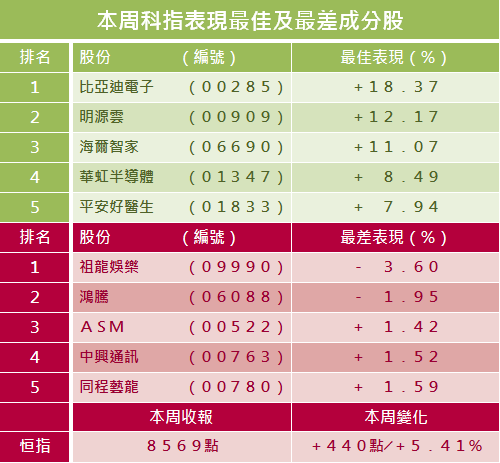 恒指本周在28132點至28938點間波動,上下波幅806點,全周升602點或2.13%;國指在10849點至11217點間波動,上下波幅367點,全周升251點或2.29%,報11217點。科指本周在7906點至8569點間波動,上下波幅663點,全周升440點或5.41%,報8569點。
