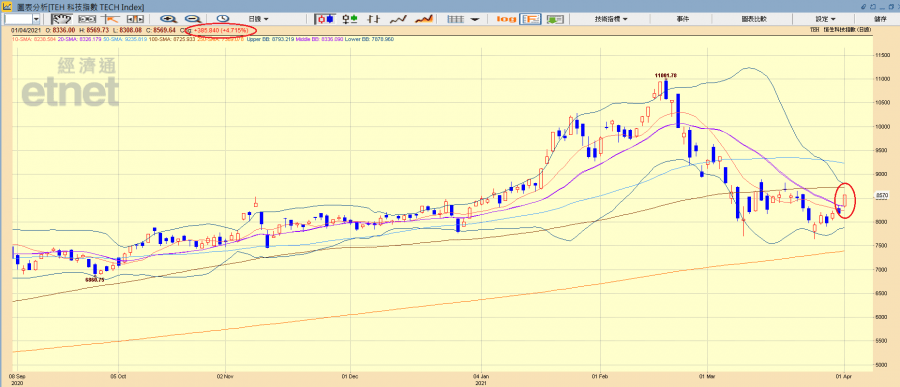 科指飆升4.7%,報8569點。(經濟通HV2系統截圖)