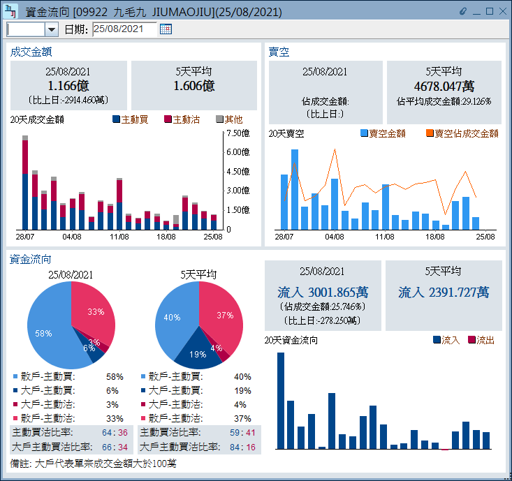 而九毛九大戶入市態度略較進取,大戶主動買沽比率達66:34,獲近3002萬元淨主動買入,佔成交金額近26%。