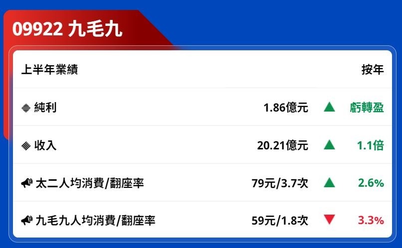 九毛九旗下擁有太二酸菜魚及九毛九山西手工面,上半年同樣虧轉盈,賺1.86億元人民幣,收入按年增1.1倍,營運餐廳按年多逾30%至419間。兩個品牌的翻座率均輕微較去年高,但人均消費按年跌逾3%。