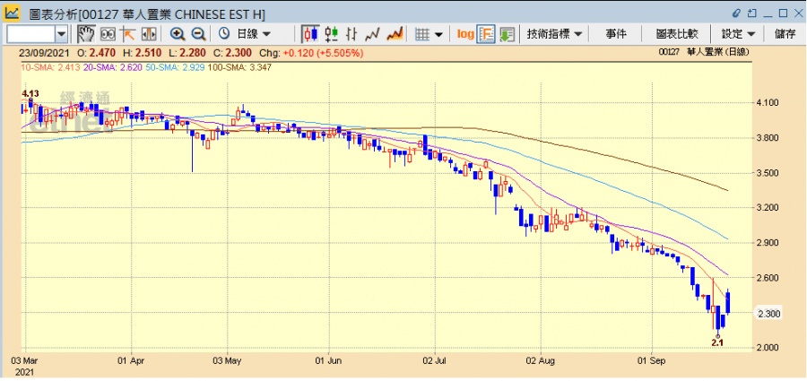 受出售恒大股權消息刺激,華置曾升逾一成,半日則升5.51%報2.3元。