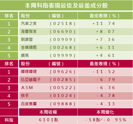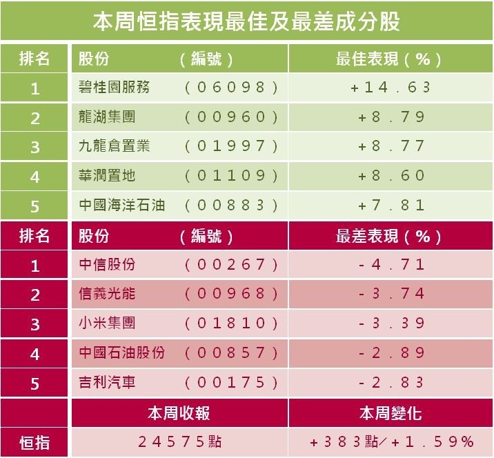 恒指本周在24045點至24694點間波動,上下波幅648點,全周升383點或1.59%,收報24575點;國指本周在8536點至8797點間波動,上下波幅261點,全周升121點或1.41%,報點;科指本周在6016至6272點間波動,上下波幅256點,全周跌58點或0.95%,報6101點。