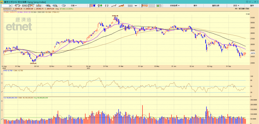 周一(27日),港股受惠華為太子女孟晚舟向好,三桶油隨油價繼續向上,恒指升16點報24208點,中海油(00883)炒回A收漲逾半成。周二(28日),傳中國政府計劃爭取國有企業及有國家背景的地產商參與收購恒大資產,但不太可能直接干預以解決恒大的危機,內房及物管股造好,港股升291點報24500點。周三(29日),消息指政府擬放寬強拍門檻,加快舊區重建步伐中國恒大出售盛京銀行(02066)兩成股權套現,中港地產股齊漲,升163點報24663點。