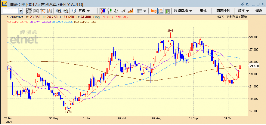 繼最近多家內地車企公布9月產銷數據顯示銷量有反彈跡象後,乘聯會近日亦公布汽車行業數據,其中一如預期乘用車市場零售偏弱,但新能源車銷量卻大增逾兩倍,並料10月汽車銷量應會比9月好,而就芯片短缺問題,工信部指將開展汽車強鏈補鏈行動,集中力量解決芯片短缺問題,刺激汽車股今日(15日)普遍急升逾半成,其中吉利汽車(00175)升近8%,為表現最佳藍籌。