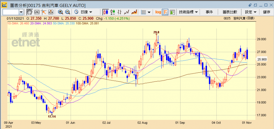 近期整個內地汽車行業受芯片短缺問題困擾,行業銷售數據及車企公布的業績都不太理想,但吉利汽車(00175)最近就動作多多,除發布「智能吉利2025」戰略外,更以總代價約56.022億元人民幣向主席兼主要股東李書福所持吉利集團收購電動車業務極氪近10%股權。這個消息集團其實早於兩星期前已預告,當時更有大行唱好,但吉利今日(1日)仍跌逾4%。