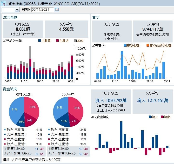 若仔細分析信義光能和信義玻璃的買家入市情況,後者的買家更進取。事關信義玻璃的大戶(單宗成交金額大於100萬元)主動買沽比率為76:24,較過往五個交易日平均的53:47明顯改善,反映不少大戶買家趁低位勇敢掃貨。相反,信義光能的大戶主動買沽比率為39:61,屬不及格水平,並較過往五個交易日平均的58:42遜色,反映大戶質貨態度轉為積極。