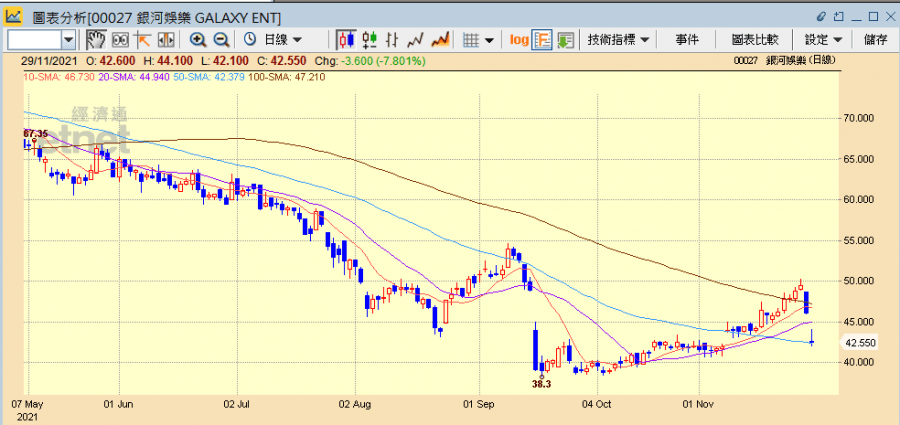 新冠變種病毒Omicron來勢洶洶,據報其傳播力高,且或削弱疫苗功效,除非洲外,在英國及本港亦已發現個案,市場擔心新變種病毒會影響港澳與內地通關進度,再加上澳門博彩中介龍頭太陽城集團(01383)主席周焯華涉及跨境賭博犯罪集團被捕,令近日熱炒通關概念的濠賭股繼上周五(26日)急跌後,今日(29日)全線再插逾半成,其中銀娛(00027)半日跌近8%,為表現最差藍籌,美高梅(02282)及澳博(00880)則雙雙跌近一成。