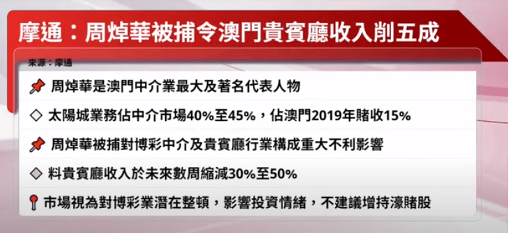 摩通發表研究報告指,太陽城為當地貴賓廳中介的龍頭,業務分別佔當地市佔率40至45%,及2019年澳門整體博彩收益約15%。周焯華被捕對澳門博彩業而言是驚弓之鳥,或導致澳門未來數周貴賓廳博彩收入大跌三至五成。惟摩通補充,澳門貴賓廳業務佔博彩業2019年EBITDA不足15%,經過去年以來的嚴格審查,預計有關業務僅佔後年EBITDA約1至4%,因此不會改動對行業的預測。摩通又稱,事件雖只與中介及貴賓廳業務有關,惟投資者或將有關消息視作對賭業的潛在整頓,將影響市場投資情緒,因此不建議大手增持相關股份。
