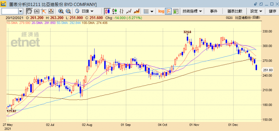 比亞迪(01211)和贛鋒鋰業(01772)等新能源車相關股份一向熱炒,惟臨近年尾股價持續下跌,其中贛鋒今日(20日)再急跌逾一成,不過,兩股今年仍有升幅,其中比亞迪年初至今累升一成三,贛鋒則累升近一成,同期吉利汽車(00175)累跌約一成七,廣汽(02238)跌逾8%,長汽(02333)幾乎無升跌,而恒指則跌約一成七,這樣看來,比亞迪和贛鋒仍大幅跑贏其他汽車股及恒指,年尾計數下,被追沽難免。而恒指仍跌跌不休,今日再跌逾400點跌穿23000點,加上美國電動車同業亦傳來壞消息,比亞迪和贛鋒連同其他汽車股也借勢下挫。