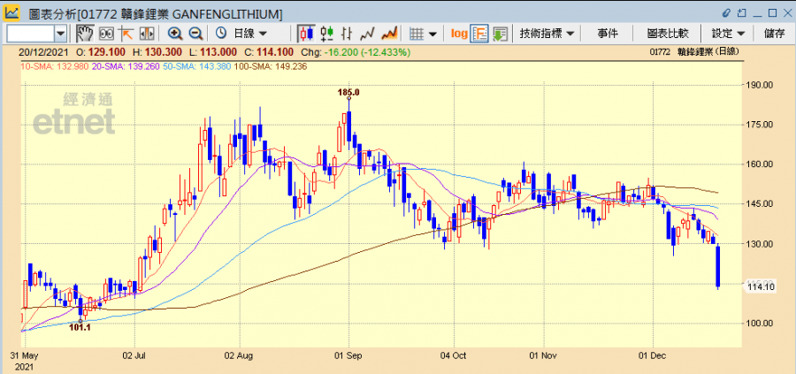 贛鋒今日收市跌12.44%收報114.1元,成交11.61億元;比亞迪則跌5.27%收報251.6元,成交20.13億元。理想汽車挫3.52%收報112.4元 ,小鵬汽車跌3.46%報159.1元,廣汽跌5.3%報7.69元,長汽跌5.59%報26.2元,吉利跌2.01%報21.95元。