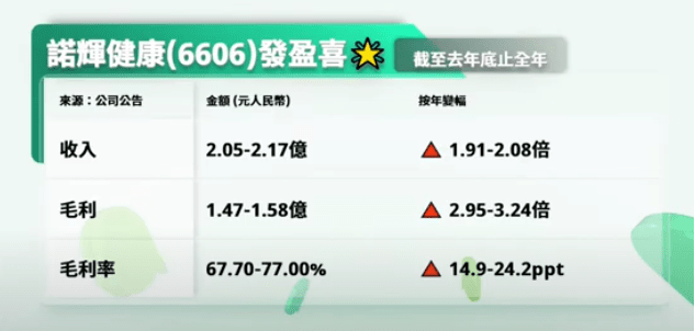 諾輝健康公布,預期截至2021年12月31日止年度收入總額將介乎2.05億至2.17億元人民幣之間,按年增長1.91倍至2.08倍;毛利預期將介乎1.47億至1.58億元人民幣之間,按年增長2.95倍至3.24倍;毛利率料升至67.7%至77%,遠高於2020年同期約52.8%。