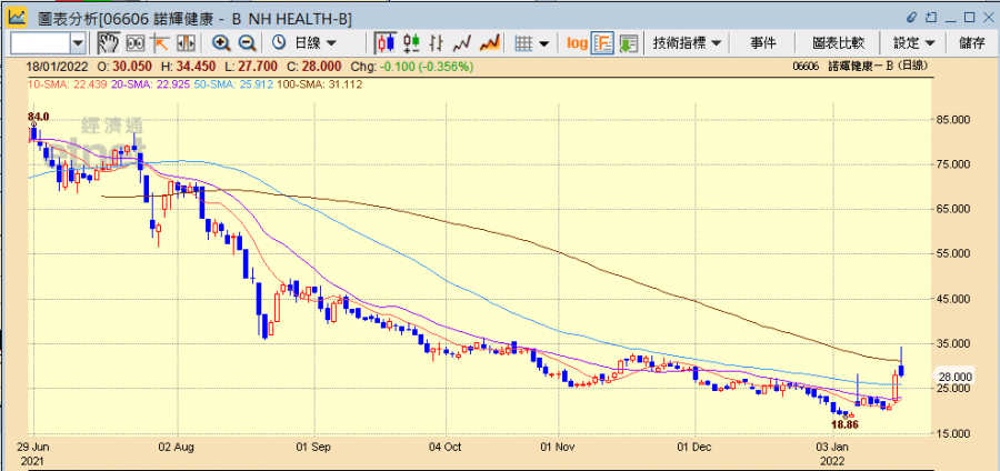 B仔股諾輝健康(06606)上周五(14日)發盈喜,收入及毛利分別增長兩倍及3倍,加上胃癌篩查自測產品「幽幽管」今日(18日)上線天貓,瑞銀又上調目標價至52元予買入評級,股價已連升兩日,今日曾再飆逾兩成高見34.45元,3日累升六成七,惟其後愈升愈少,最終倒跌收市。