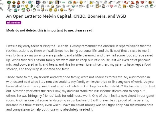 就在周四,WSB論壇上出現一封致Melvin Capital(稍早時被逼平倉的對沖基金)、CNBC等的公開信,稱自己十幾歲的時候正趕上2008年金融危機,直指Melvin是一家靠剝削別家公司、操縱市場及媒體賺錢的公司;又指CNBC的固定觀眾會很快年老,而WSB用戶等將記得其是如何為那些「摧毀我們很多人」的公司代言,而且還企圖打垮小人物。