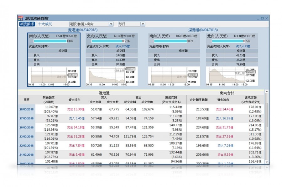用戶可於HV2畫面上隨時翻查過去約兩個月上述四個滬深港通渠道每個交易日的餘額、買入成交金額、賣出成交金額、買入交易宗數、賣出交易宗數和總成交金額,從其變化中了解市場大戶參與者(特別是中資的舉動)。此外,額度資金流入/流出的變化亦會清楚顯示,一目了然。最後,為了讓用戶可以深入研究滬深港通的資金流向變化,HV2表列了每個交易日的買入與賣出的成交宗數與總成交金額佔大市總成交金額比率,亦會分別將滬港通與深港通的南向交易/北向交易合計,得出合計額度餘額、合計資金流入/流出和合計總成交金額佔大市總成交金額比率。
