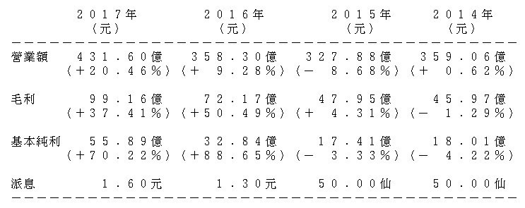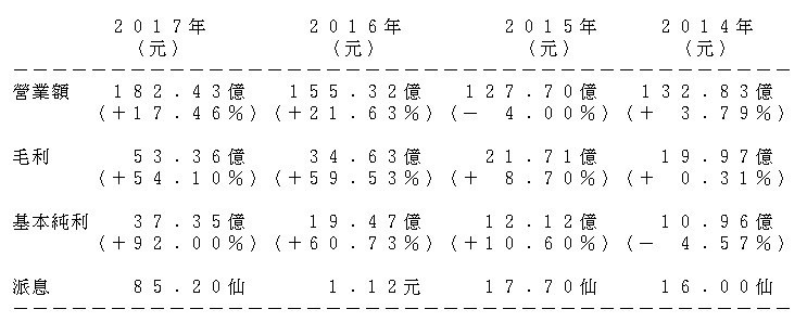 建滔化工業務除來自覆銅面板外,其印刷線路板佔去年總收入近兩成,兩項業務合共佔總收入約53%。事實上,美洲地區收入亦只佔其總收入不足2%,故中美貿易戰對其影響實在相當輕微。建滔化工去年業績同樣標青,去年基本純利增長70%,至55.89億元;營業額上升20%,至431.6億元。該股沒有如2016年派特別息,但2017年共派1.6元,較2016年的連特息1.3元高出23%,而2013年至2017年派息的年複合增長率高達33.7%。