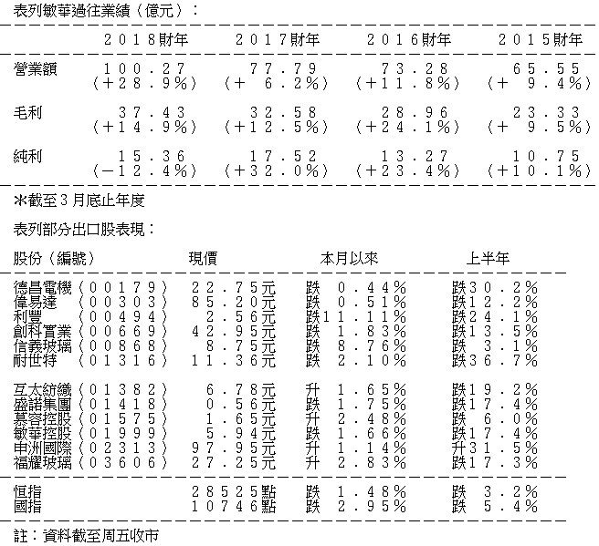 由於貿易戰的關係,花旗集團因此唱淡敏華,加上歐洲市場競爭激烈,目標價由9元下調至5.8元,評級由「買入」調低至「賣出」。事實上,自美國於今年3月中打響貿易戰第一槍後,敏華等其他出口股亦飽受沽壓,由該月中高位7.64元開始下瀉,於4月底跌至5.39元始見喘定,累計跌幅近三成。