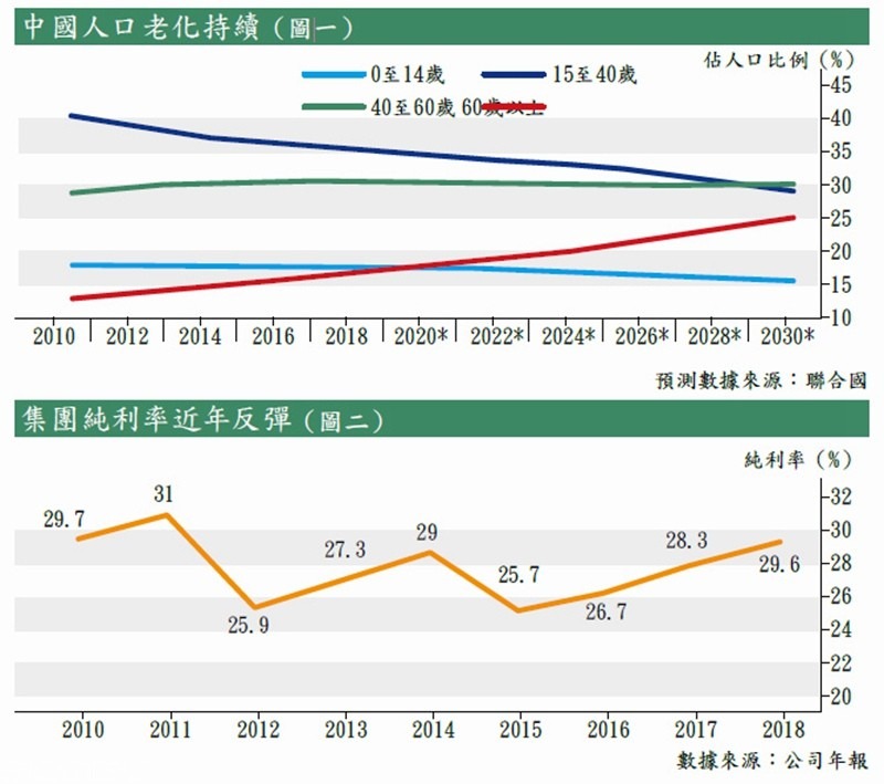 殯儀過去為人所避忌,但隨著內地思想更開放,收入水平亦提高,殯儀服務的普及度愈來愈高。大致上,殯儀服務包括遺體處理、墓地服務、殯儀服務等。根據聯合國的預測,中國老年人佔總人口比例將持續向上,預計由2018年的16.6%增至2030年的25.1%(見圖一)。隨著人口老年化,聯合國同樣預計內地死亡人口將由2010年至2015年的961萬人增至2025年至2030年的1,293萬人,有多重因素均刺激內地殯儀的發展。