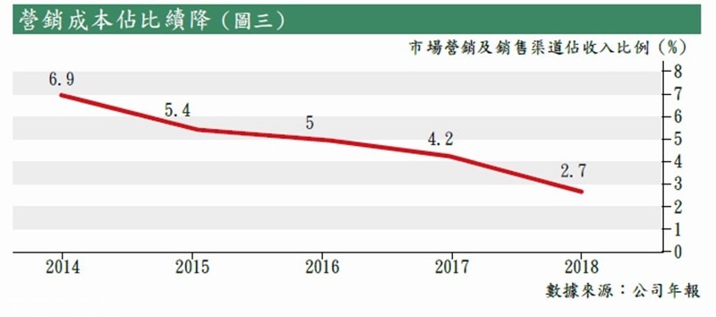 公司自今年開始加強銷售團隊,建設自營渠道,減少銷售中介的使用。去年直營比例達到91%,較2016年上升13個百分點,不單有助公司降低銷售費用,市場營銷及銷售成本佔收入比例一直下降(見圖三),同時有助提高服務質素。